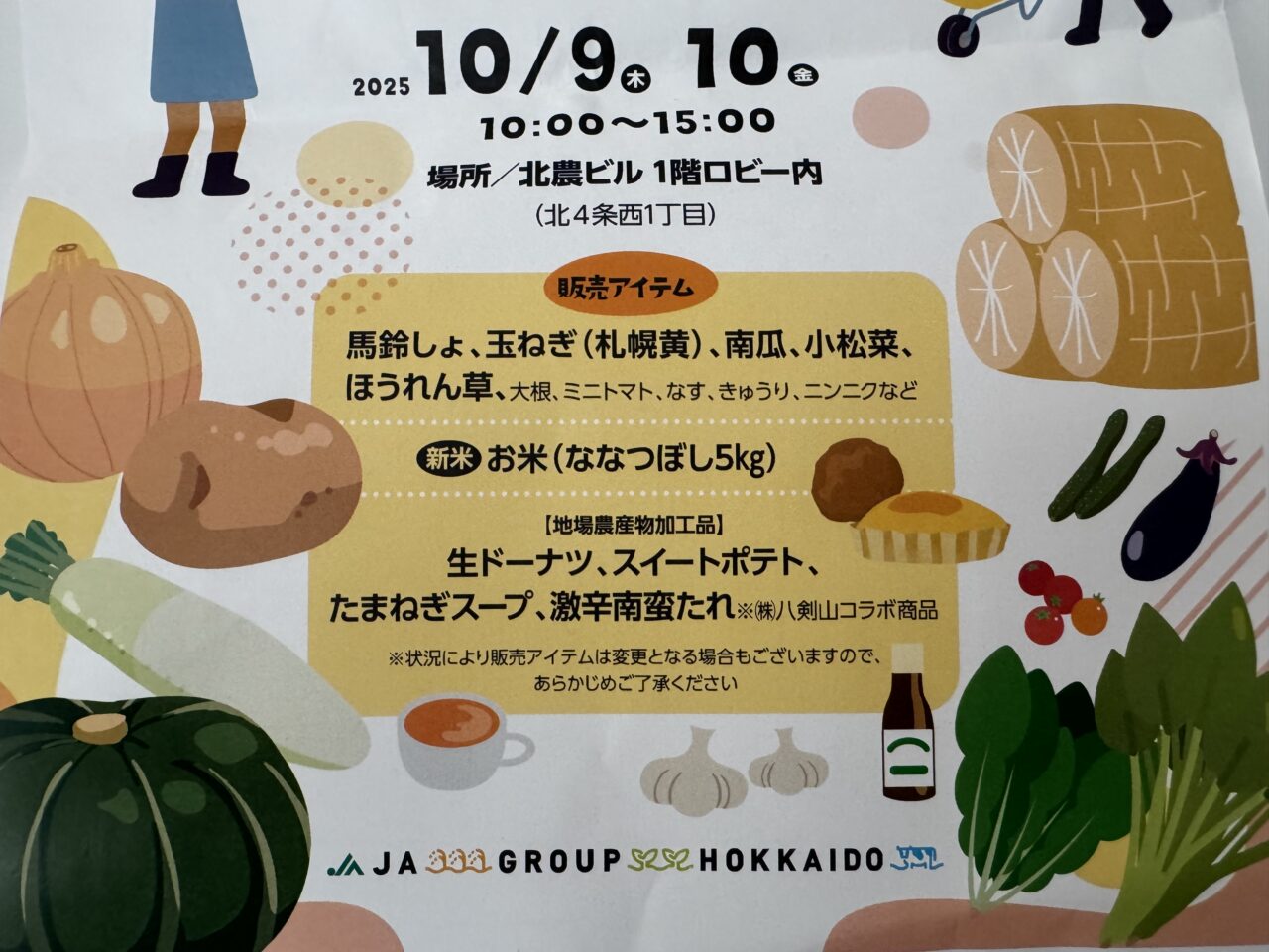 この出張直売イベントは、札幌市中央区の北農ビル1階ロビーにて2025年10月9日(木)・10日(金)の2日間限定開催。時間は10:00~15:00までとなっています。