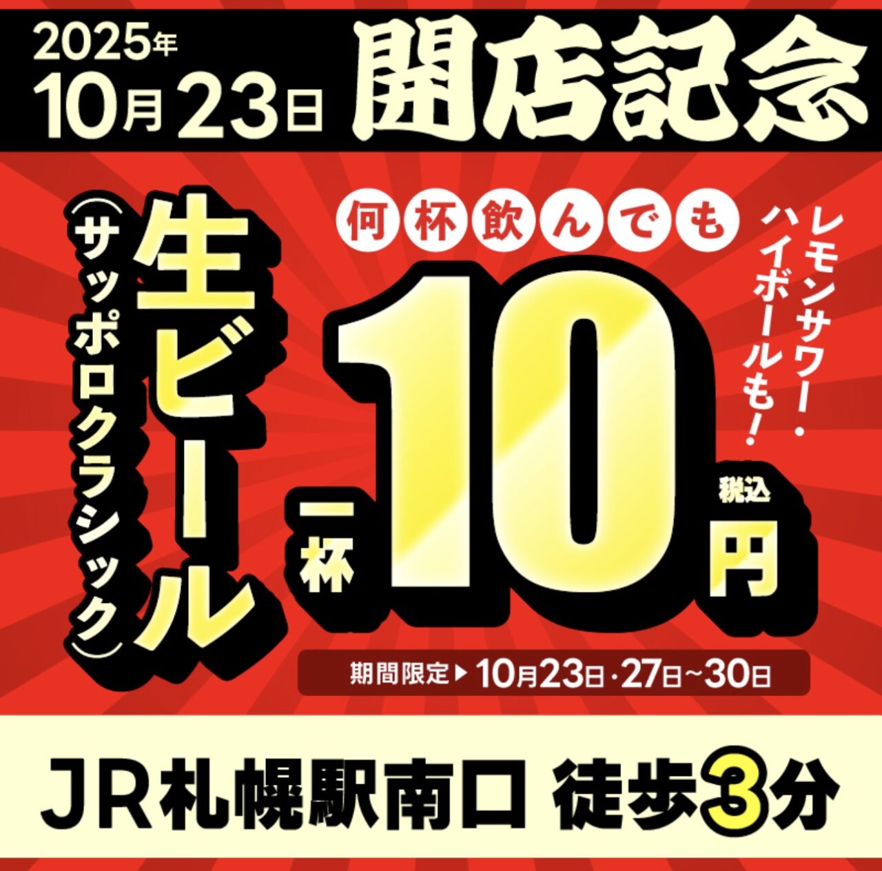 オープニング記念として、生ビール(サッポロクラシック)、ハイボール、レモンサワーが何杯でも1杯10円でお楽しみいただける期間限定セールが開催されます。(10月23日(木)、10月27日(月)~10月30日(木)限定 ※金・土曜日日不可)
