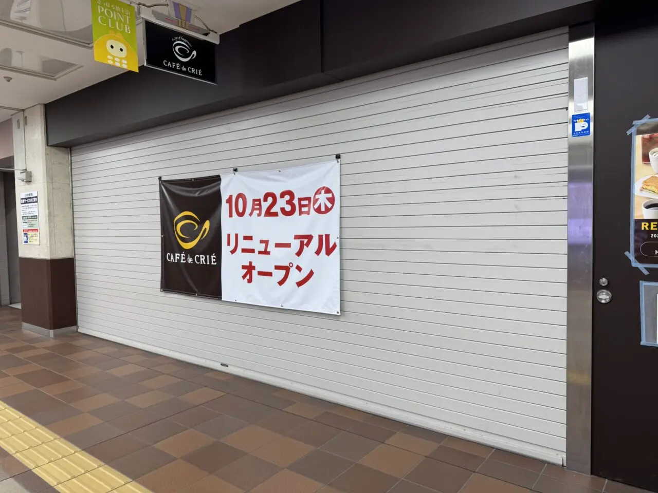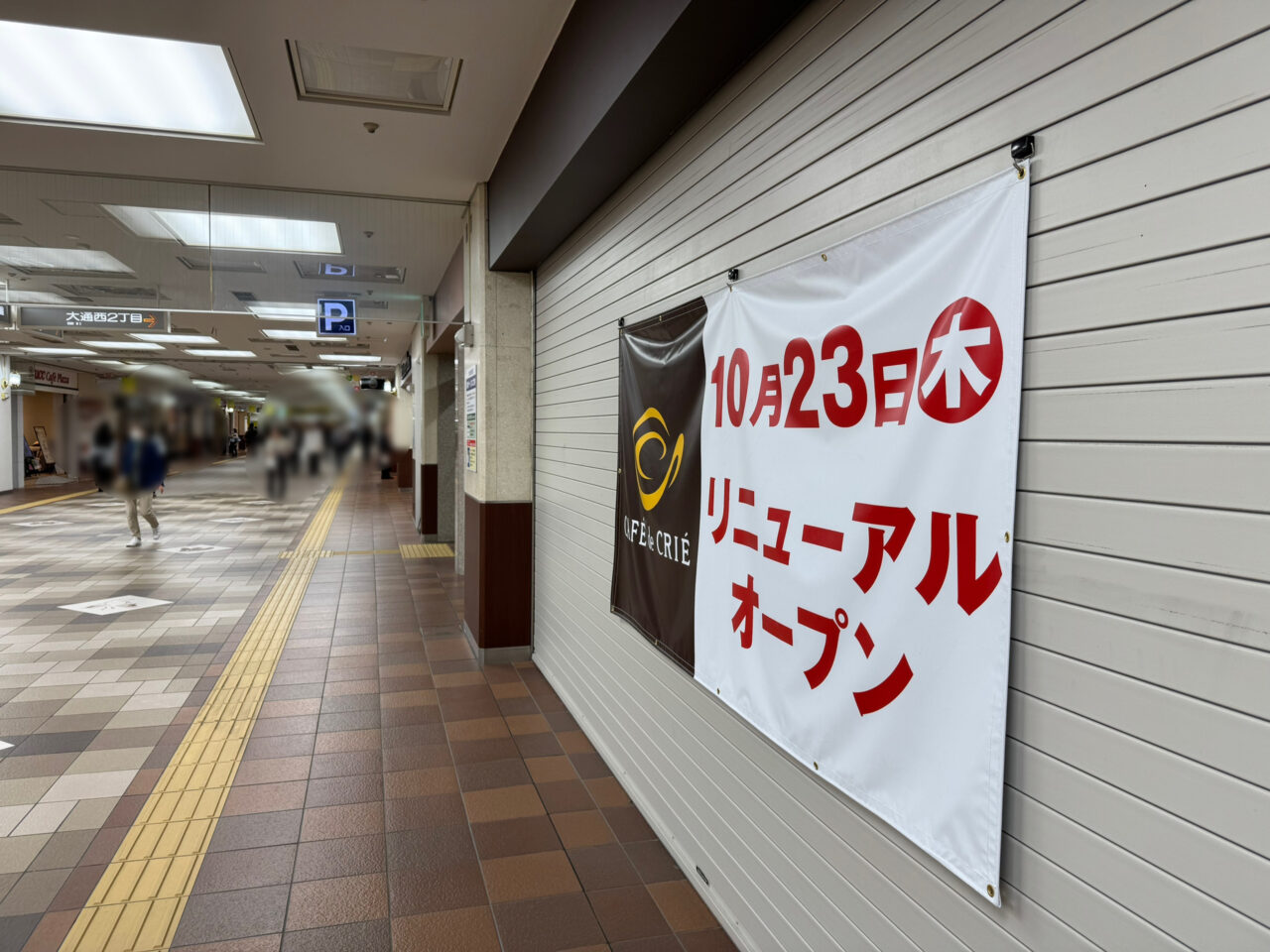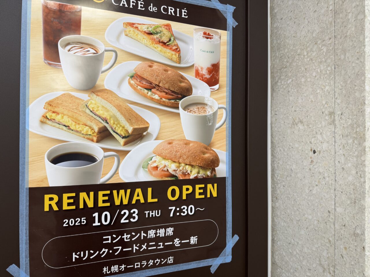 「カフェ・ド・クリエ さっぽろ地下街オーロラタウン店」が、2025年10月23日(木)にリニューアルオープンするようです。オーロラタウンは「ことりの広場」がある地下街です。