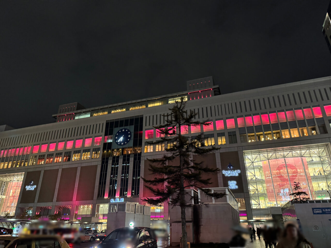 夜になるとJRタワーがやわらかなピンク色に染まり、街を優しく照らしています。