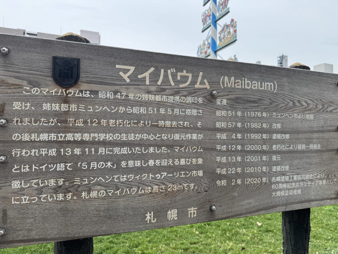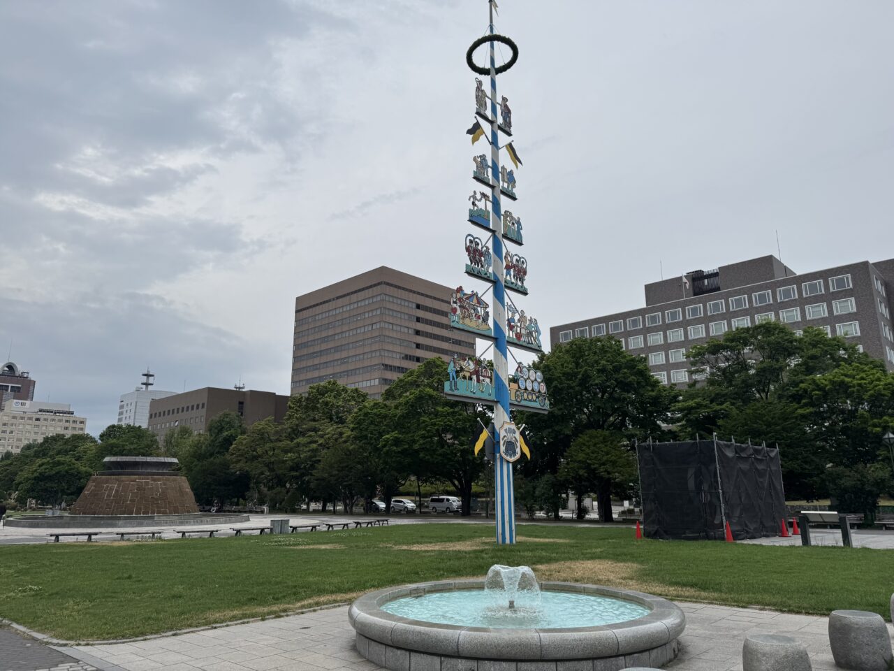 大通公園11丁目にはその絆の象徴として、ミュンヘン市から贈られた高さ約23メートルの伝統的な「マイバウム(五月柱)」で、色鮮やかな装飾とともに両市の友好を表現しているそうですよ。平成12年老朽化により一時撤退され、札幌市立高等専門学校の生徒が中心となり、復元作業が行われ再度平成13年に完成しました。