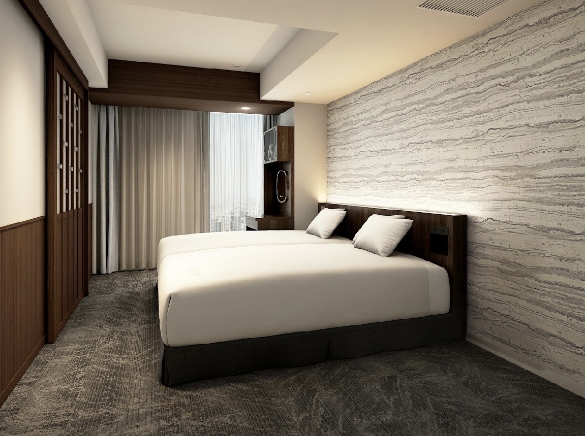 リニューアル客室の一例であるデラックスツインルームは、シングル2室を繋げることで約30㎡の広さを確保。