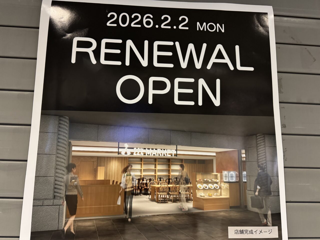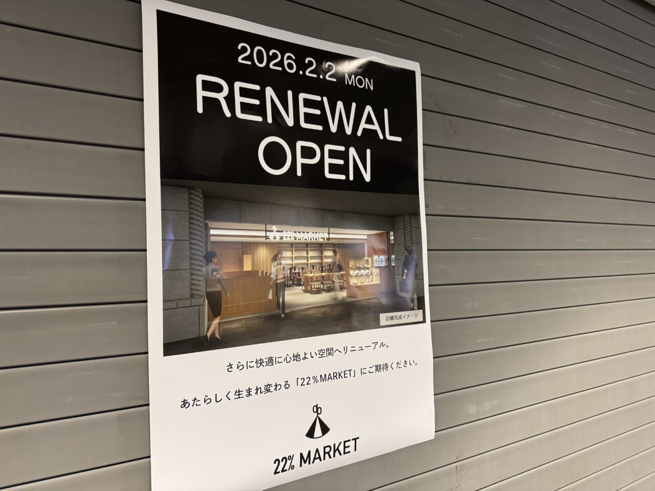 「22%MARKET」は、お客様により快適に利用してもらうため、2026年2月2日(月)に店舗をリニューアルオープンするそうです。その為、只今休業中となっています。