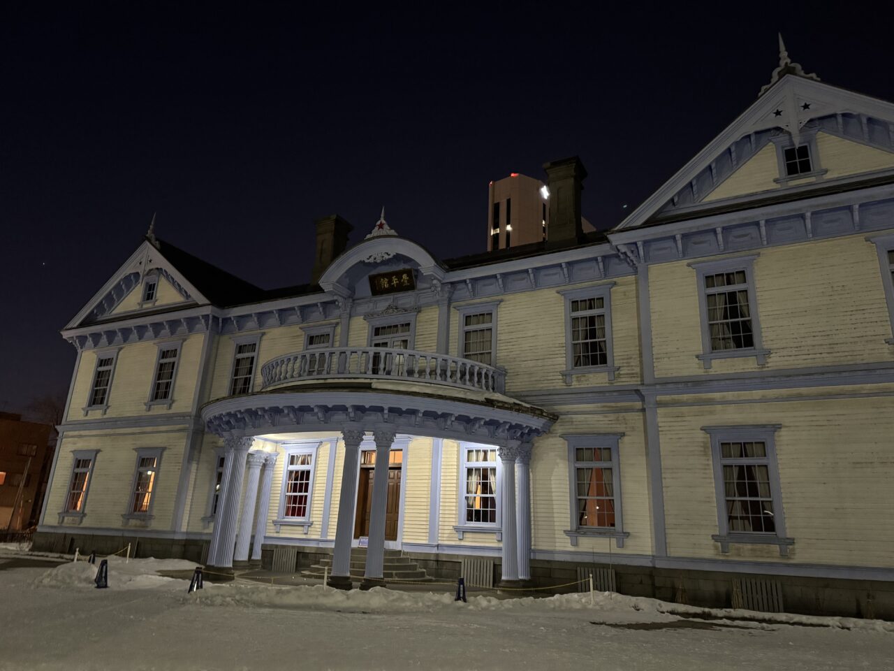 雪景色の中、やわらかな光に包まれた豊平館の外観は、昼間とはまったく異なる幻想的な表情を見せてくれますよ。