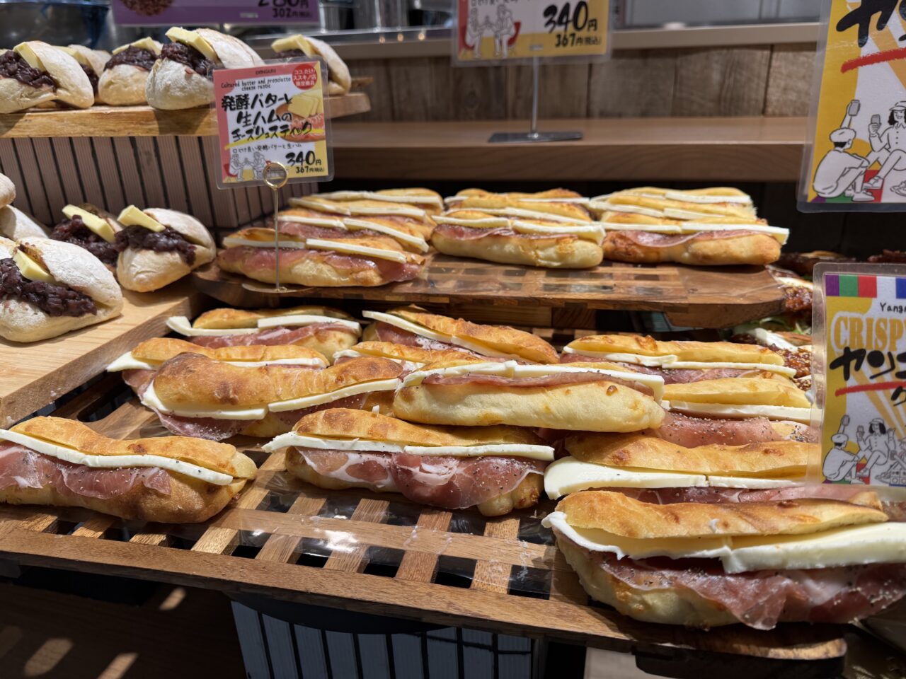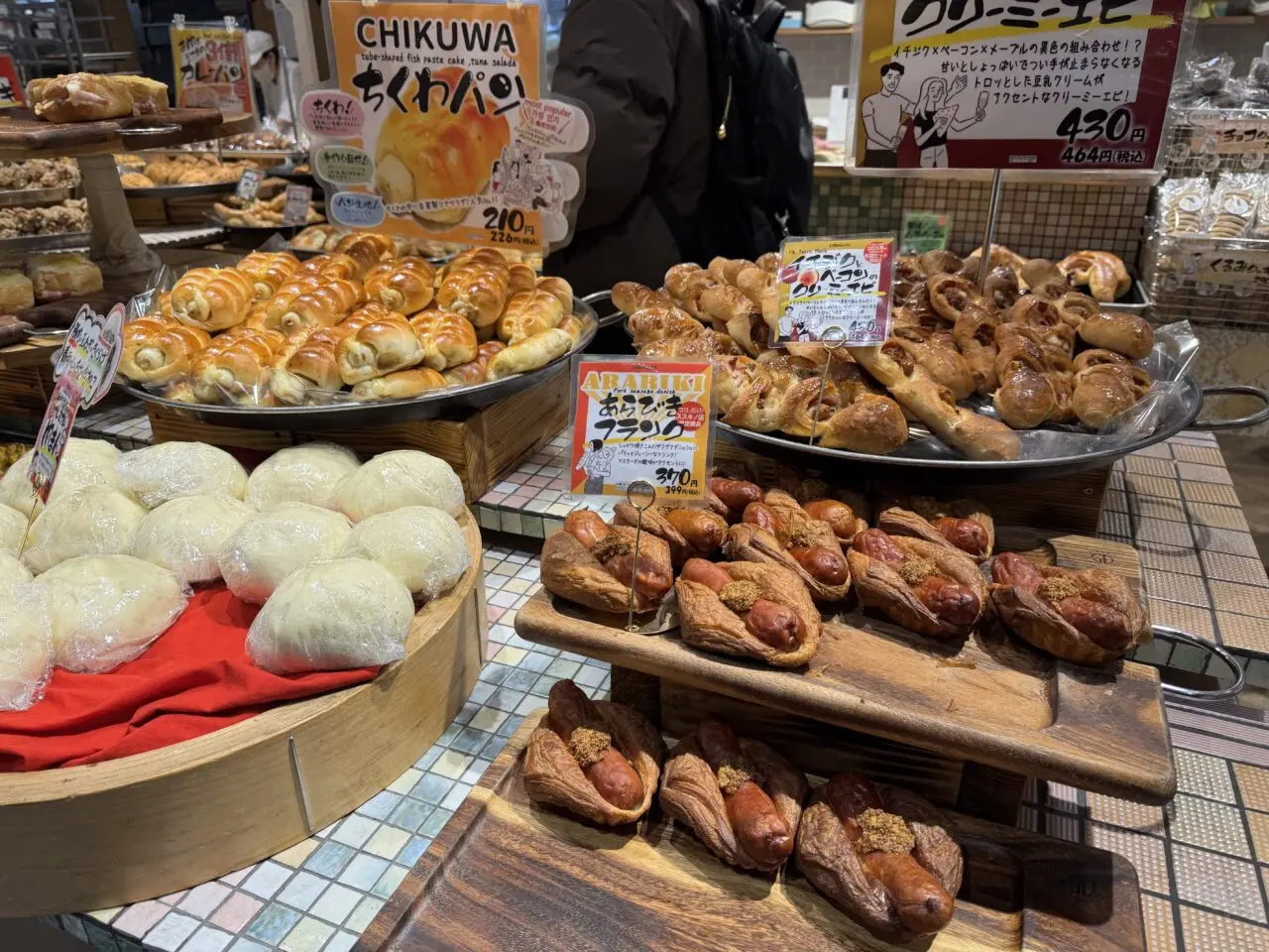 店内では、定番の「ちくわパン」をはじめ惣菜系から甘いパンまで種類豊富に並び、時間帯によっては焼き立ての商品が次々と補充されていました。