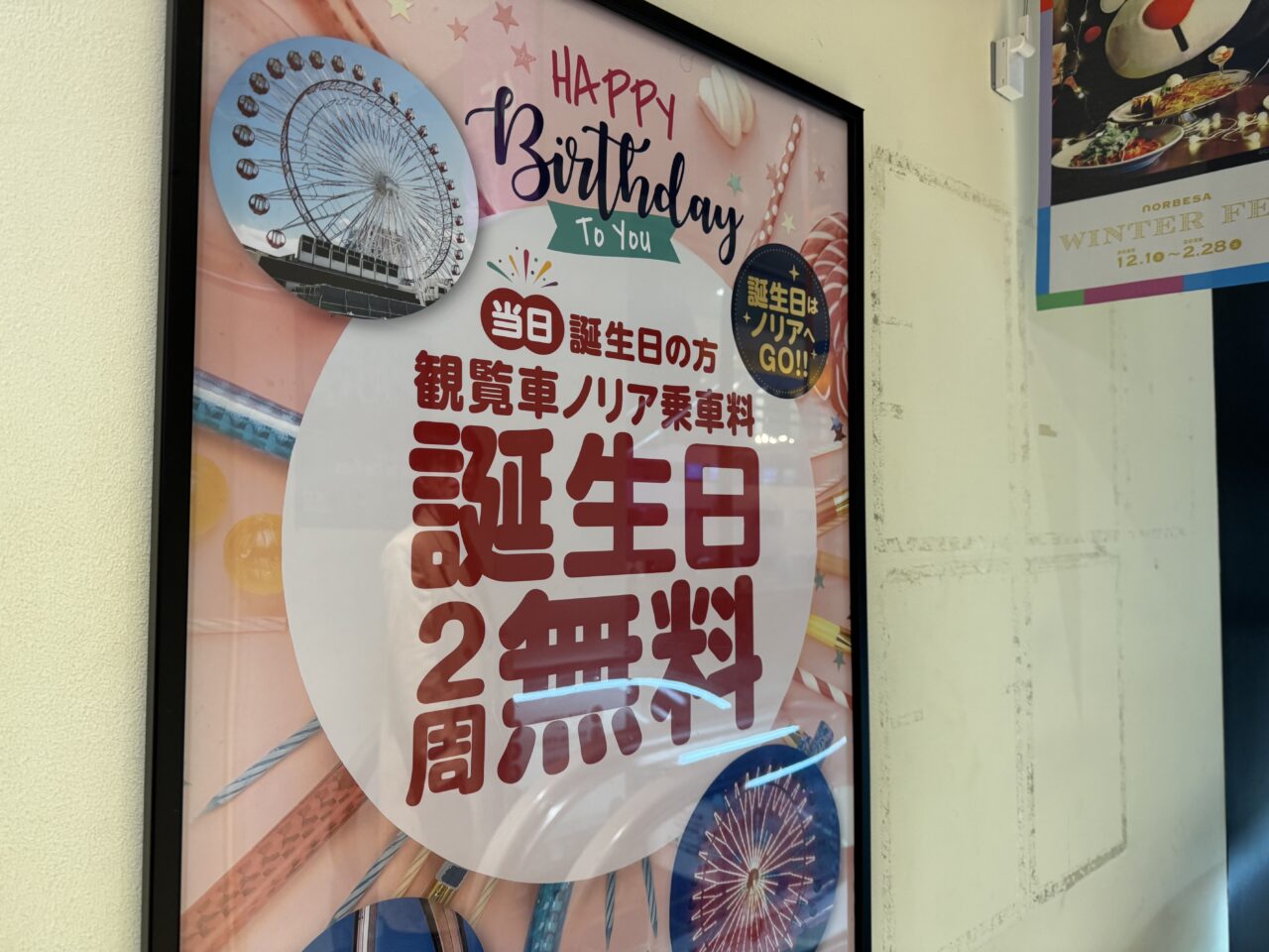 ノルベサにある屋上観覧車 「nORIA」では、誕生日当日の来場者を対象に、観覧車の乗車が2周まで無料となるうれしいサービスを実施しています。