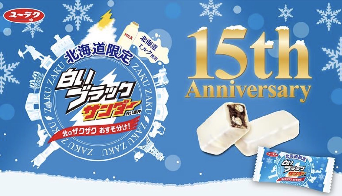 北海道みやげとして親しまれている「白いブラックサンダー」が発売15周年を迎え、記念企画が展開されます。販売元の有楽製菓は、味わいを進化させた商品リニューアルに加え、人気パフェ専門店パフェ「珈琲、酒、佐藤」とのコラボ企画など、北海道ならではの取り組みを実施すると発表しました。